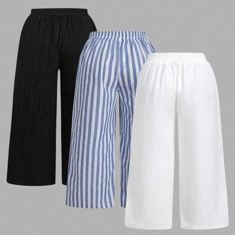 SHEIN Essnce Set de 3 pantalones casuales de mujer con estilo náutico a rayas blancas y negras, con cintura ajustable y bolsillos, de pierna recta, adecuados para vacaciones de verano