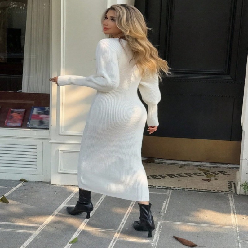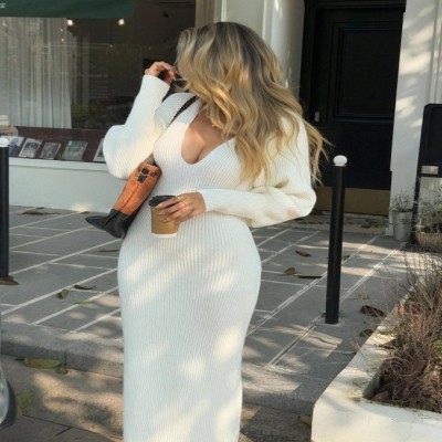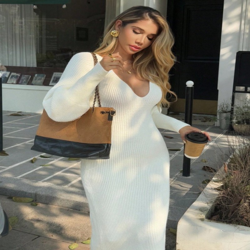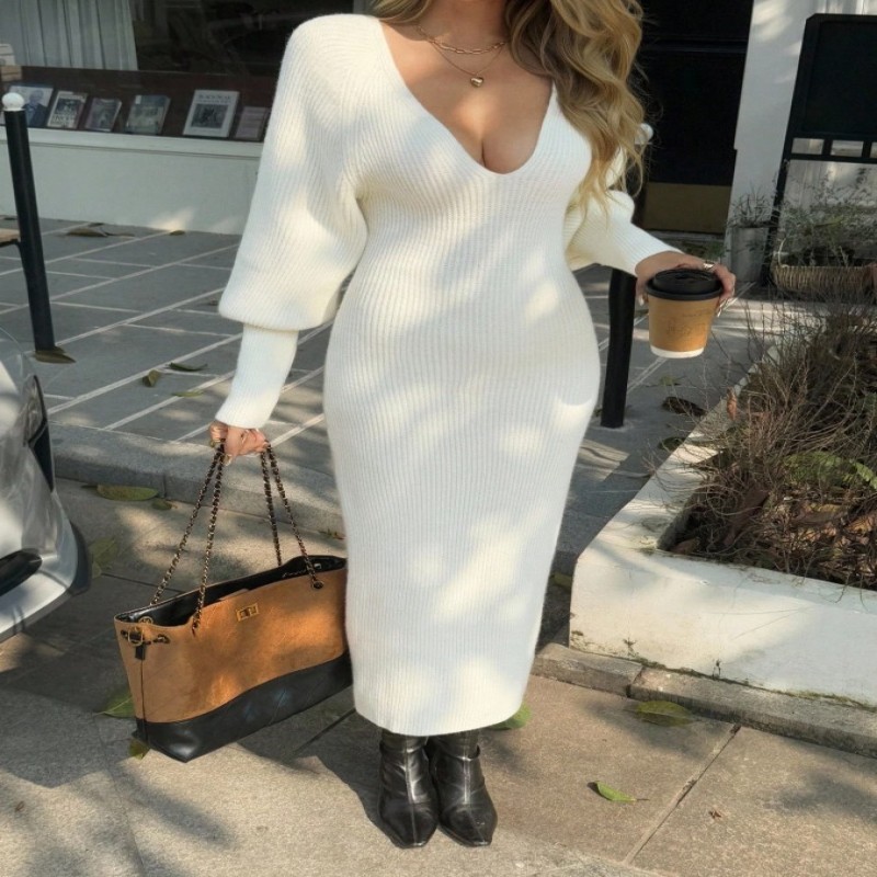 187590 Livesso Vestido de suéter de punto de manga larga con cuello en V y cintura ceñida, otoño $ 187590 |