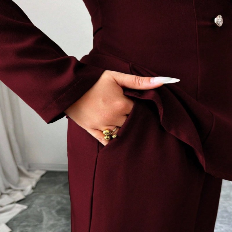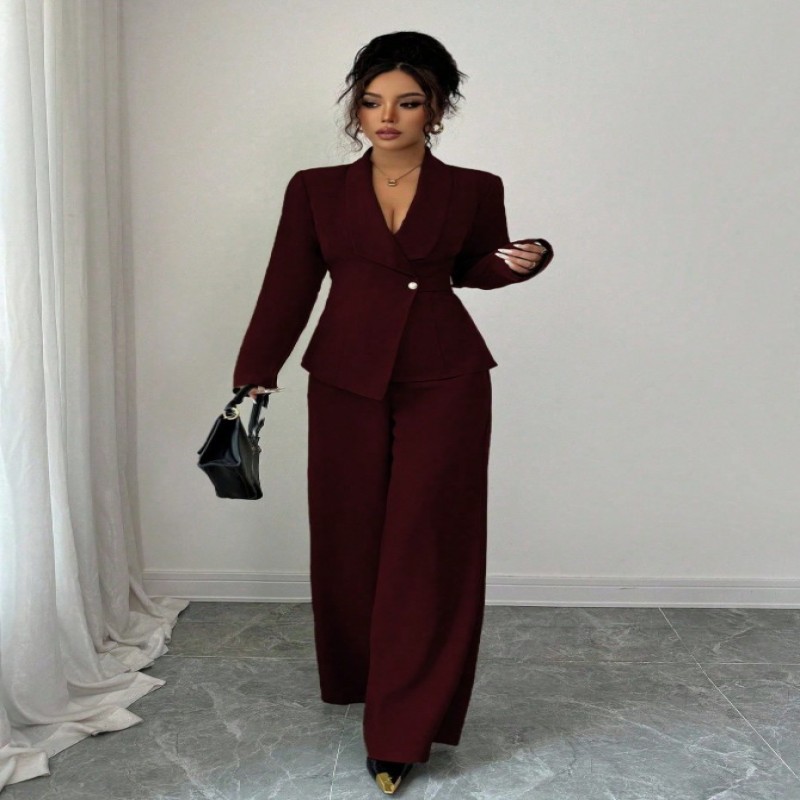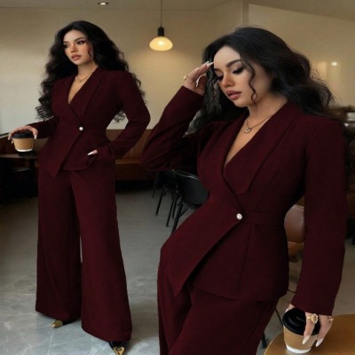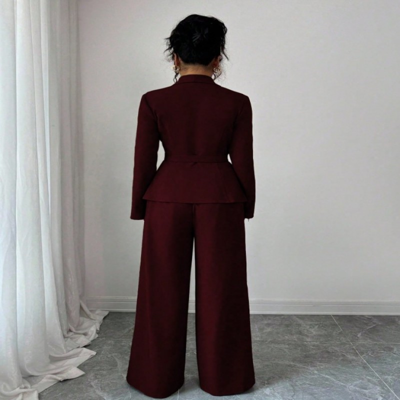Elenzga Conjunto de dos piezas de mujer con chaqueta blazer de diseño único con cinturón en la cintura, cuello en V y manga larga, y pantalón recto de pierna ancha, adecuado para el trabajo y el transporte en otoño