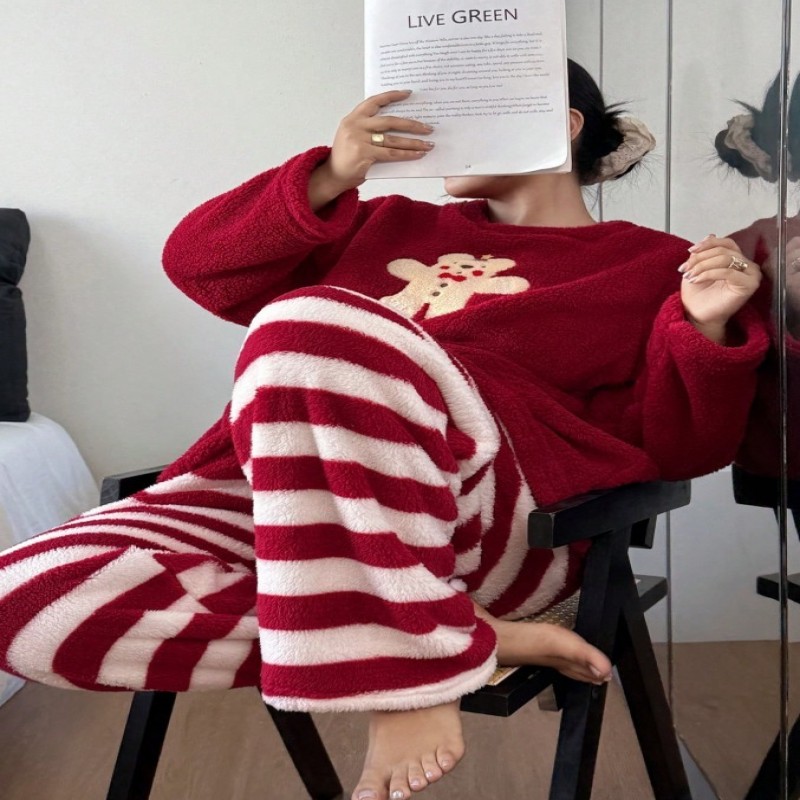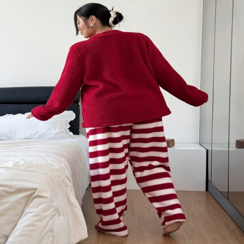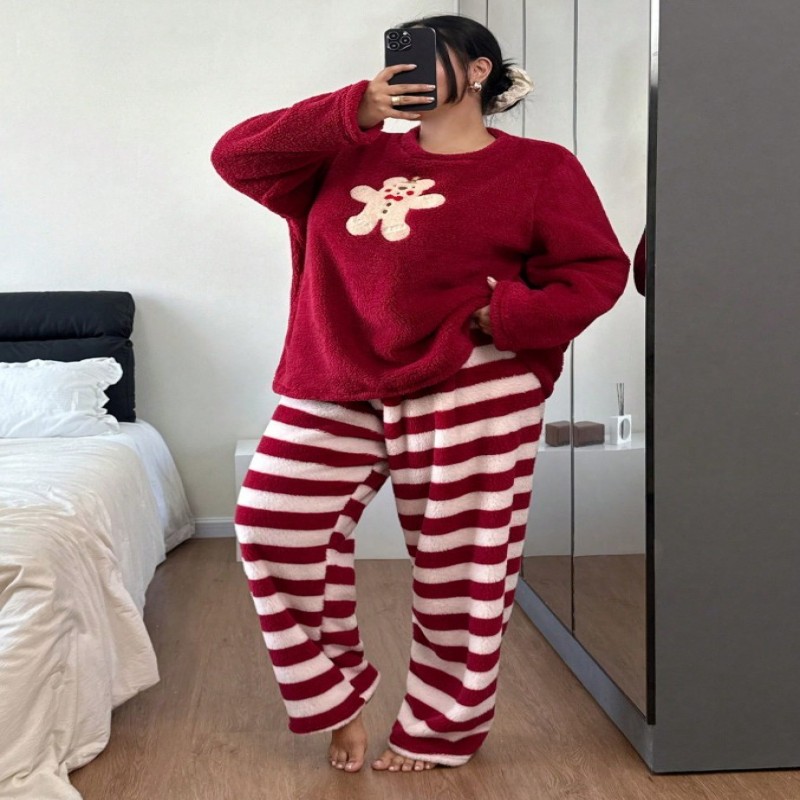 SHEIN Conjunto de ropa de dormir de talla grande para mujer, blusa roja con bordado de oso galleta y pantalones a rayas, cuello redondo, ropa de invierno esponjosa y cómoda