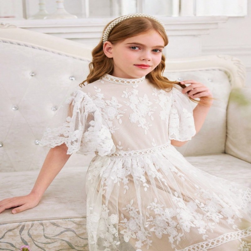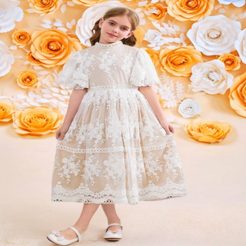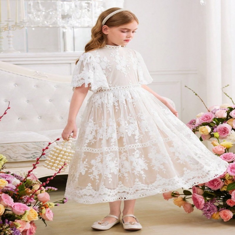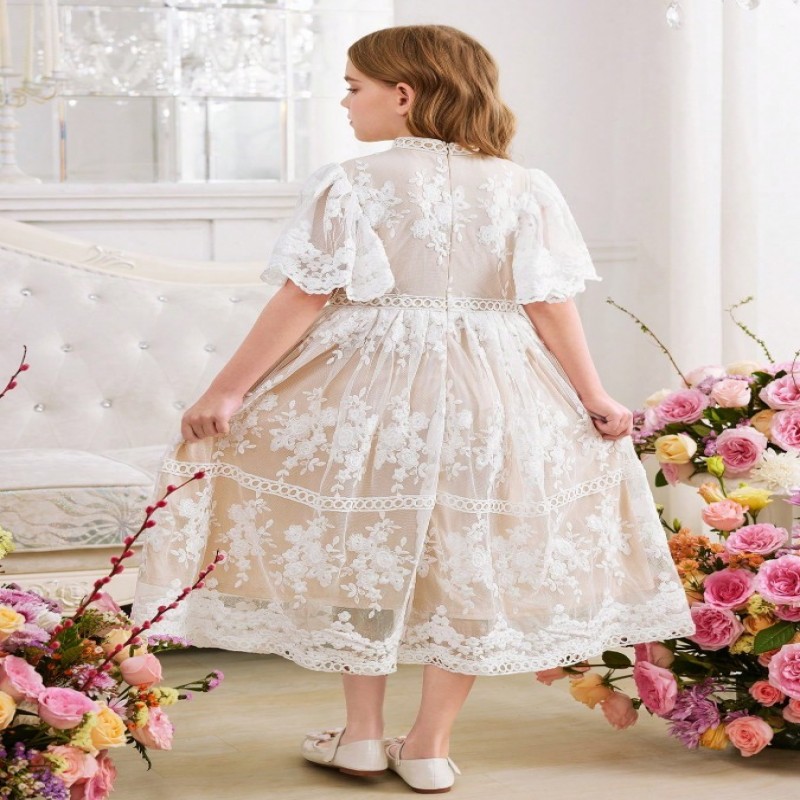 SHEIN Vestido elegante de princesa de manga abullonada ceñido a la cintura con volantes, encaje bordado y malla trenzada para niñas preadolescentes, para boda, fiesta, baile de graduación, vacaciones, primavera, Día de San Valentín, niña de las flores