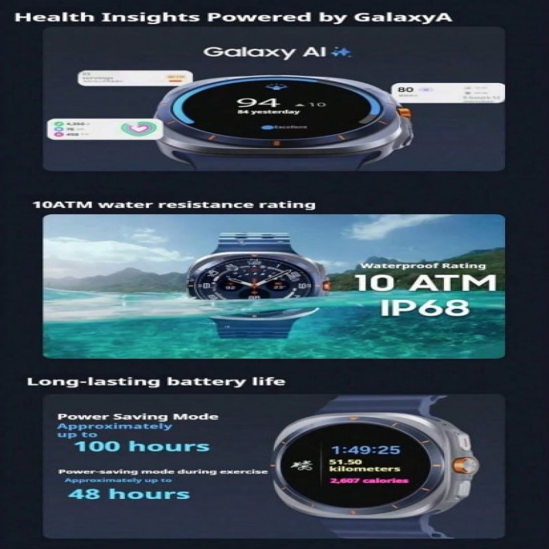 Samsung Reloj inteligente Galaxy Watch Ultra con modos deportivos inteligentes, pantalla HD para exteriores, resistencia al agua de 10ATM, monitoreo y gestión de deportes y salud, disponible en Blanco Titanio y Blanco.