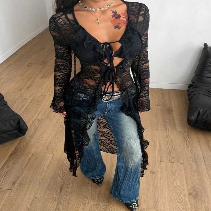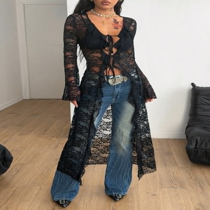 Coolane Abrigo/Cubrecuerpo largo con tirantes de malla, volantes y cintas para mujer, ideal para otoño/todo el año, para festivales de música hippie, ferias renacentistas y raves